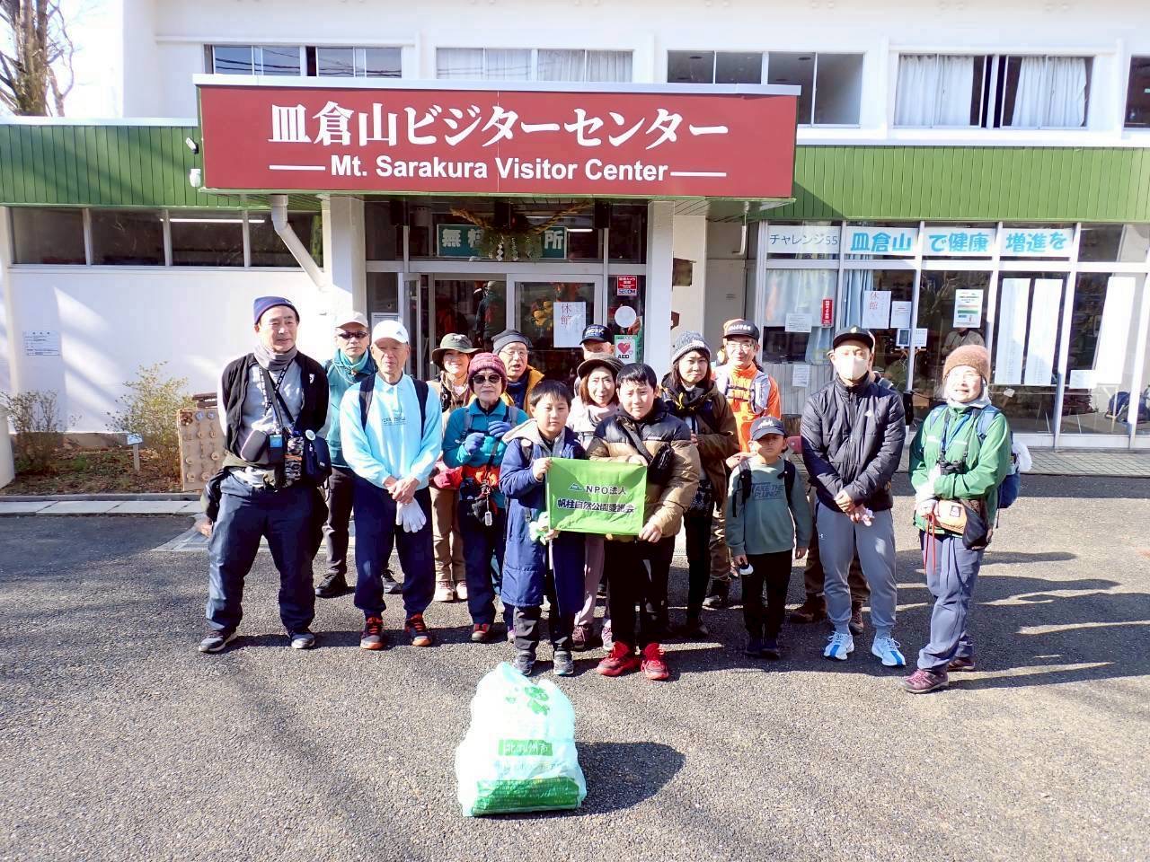 それでも参加の皆さんはゴミを゙拾いながら登って行き8合目の皿倉平に到着しました。皿倉山山頂のテレビ塔が見え、もう少しだと言う声が聞こえ、皿倉平で一斉にゴミを゙拾ってからビジターセンターに到着しました。清掃登山を終え、最後に達成感溢れる笑顔で記念写真を撮りました。