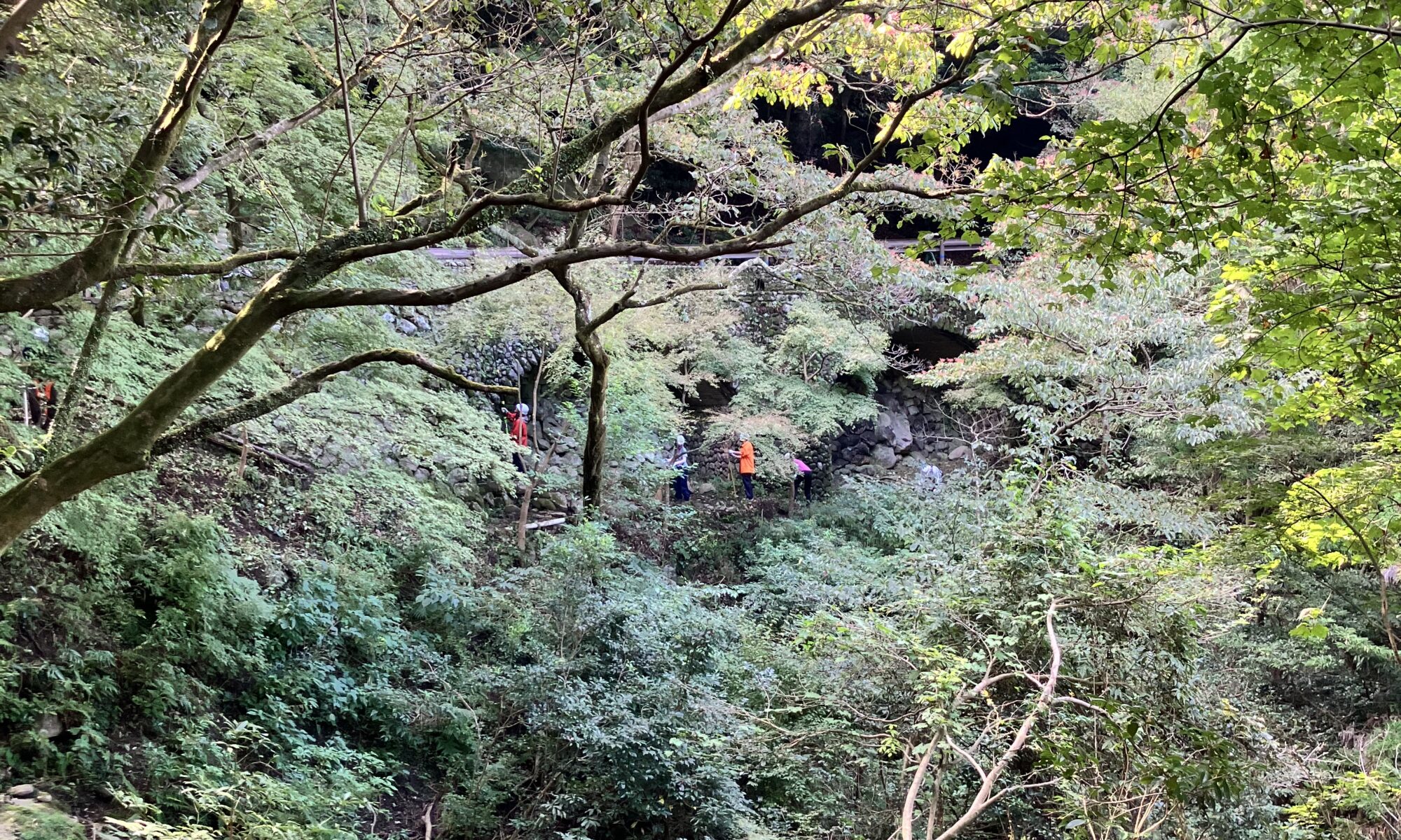 楓杉峡は、イロハモミジと杉のコントラストと、アーチ状の石積みの橋梁が見どころ。皿倉山を訪れる方に注目いただける景観にすべく、保全活動を行います。