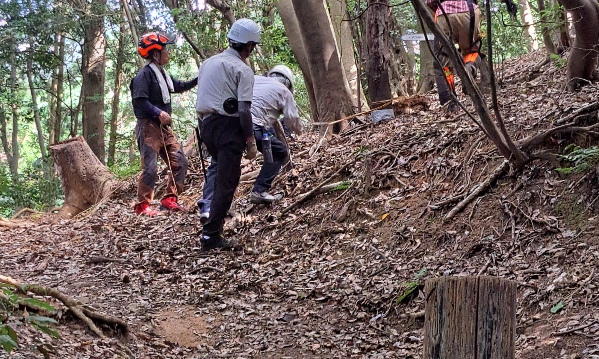 2グループ合流してお昼ご飯でエネルギー補充した後は、次の作業へ。伐木作業が中心だったので、チェーンソーやロープを使って安全第一で作業を行いました。